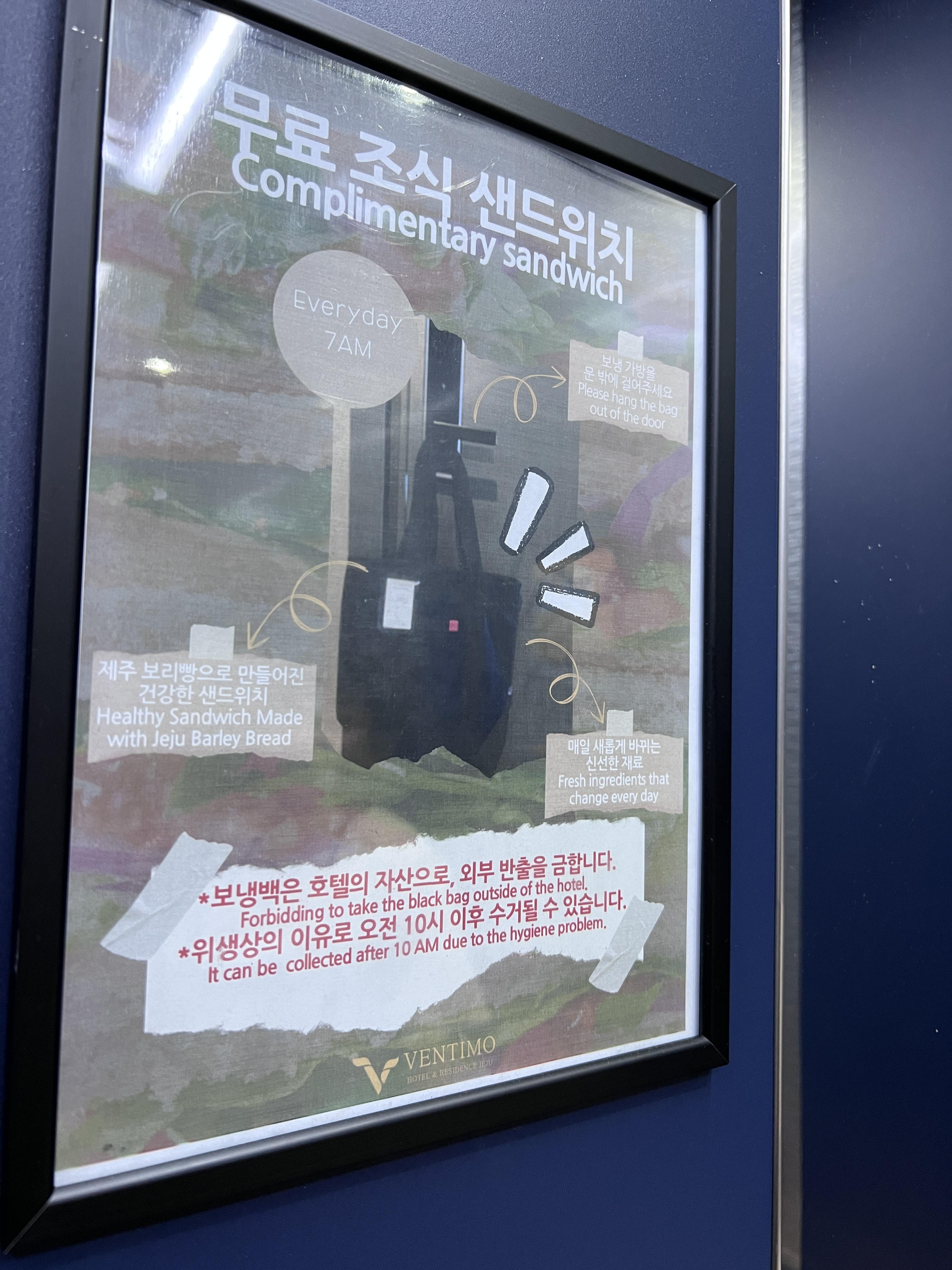 벤티모의 가장 사랑스러운 점은 아침 조식 서비스 인거 같아요. 보냉백을 밖에 걸어두면 인원수 만큼 샌드위치를 넣어주시는데 샌드위치만 있는게 아니라 조그만 사탕과 오렌지 한조각, 자몽한조각이 같이 들어 있었어요. 저희는 아이까지 같이 예약인원에 넣어서 총 3개를 주셨는데 아침 일찍 바쁜데 진짜 든듣히 먹을 수 있어서 좋았어요.
